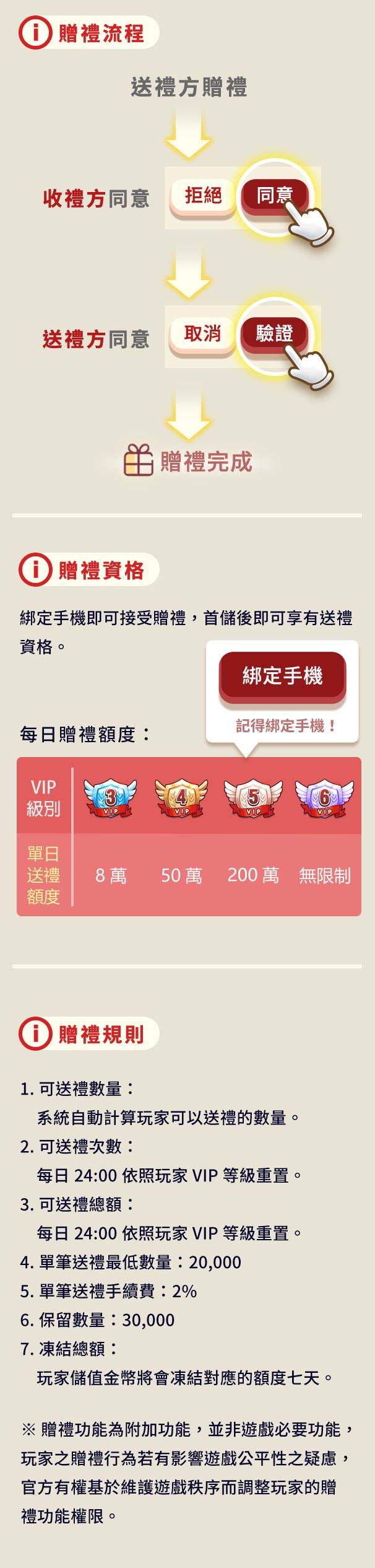 | 每日 送禮額度 | X | X | 80,000元 |